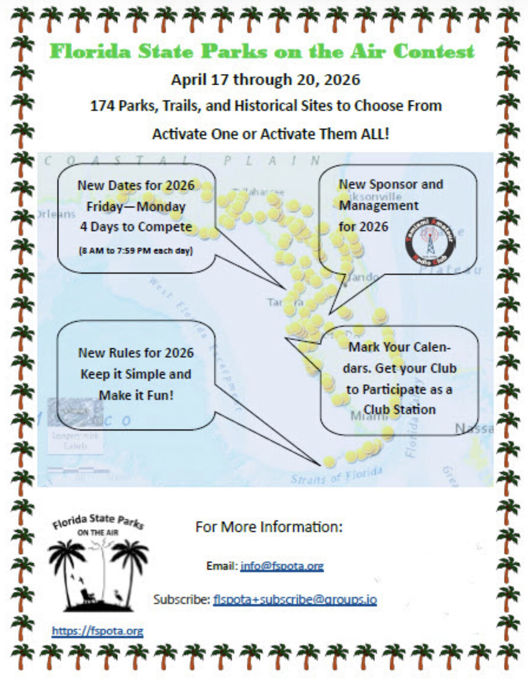 Florida hams will take to the 174 state parks and historical sites to make POTA activations over these 4 days. Participants will spot using the pota.app and compete for recognition during the contest. Please hunt them! NO logs required from hunters.