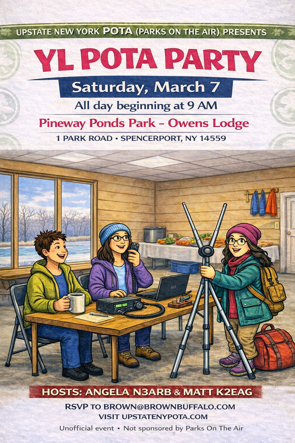 On Saturday, March 7, women interested in amateur radio and portable operating are invited to spend the day together at Owens Lodge, Pineway Ponds Park along the Erie Canal in Spencerport, NY for a relaxed YL POTA Party.